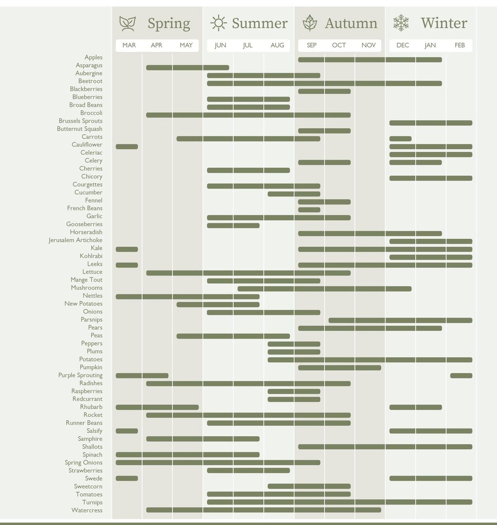 Summer (June-August): Basically everything good - berries, tomatoes, courgettes, beans, salads